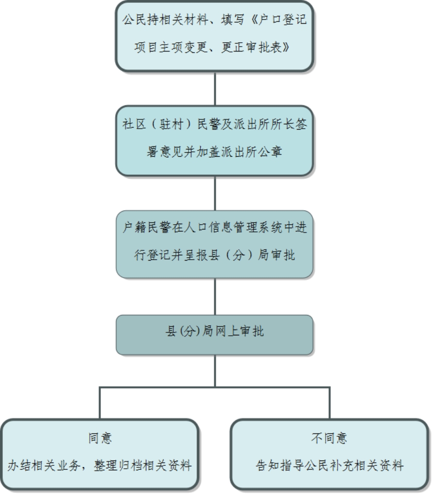 (一)公民持相关材料,到户籍地派出所填写《户口登记项目主项变更、更正审批表》,由社区(驻村)民警及派出所所长签署意见并加盖派出所公章,同时,户籍民警要在人口信息系统进行登记,扫描电子资料后,报分县局审批。
