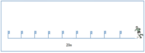 (1)平整的人工草或天然草足球场,划定25米×5米区域。起点距第一个杆距离4米,其余杆距2米,起点距终点20米,测试过程出现以下现象均属犯规行为,取消当次成绩:出发时抢跑、漏绕标志杆、碰倒标志杆、故意手球、未按要求完成全程路线等。
