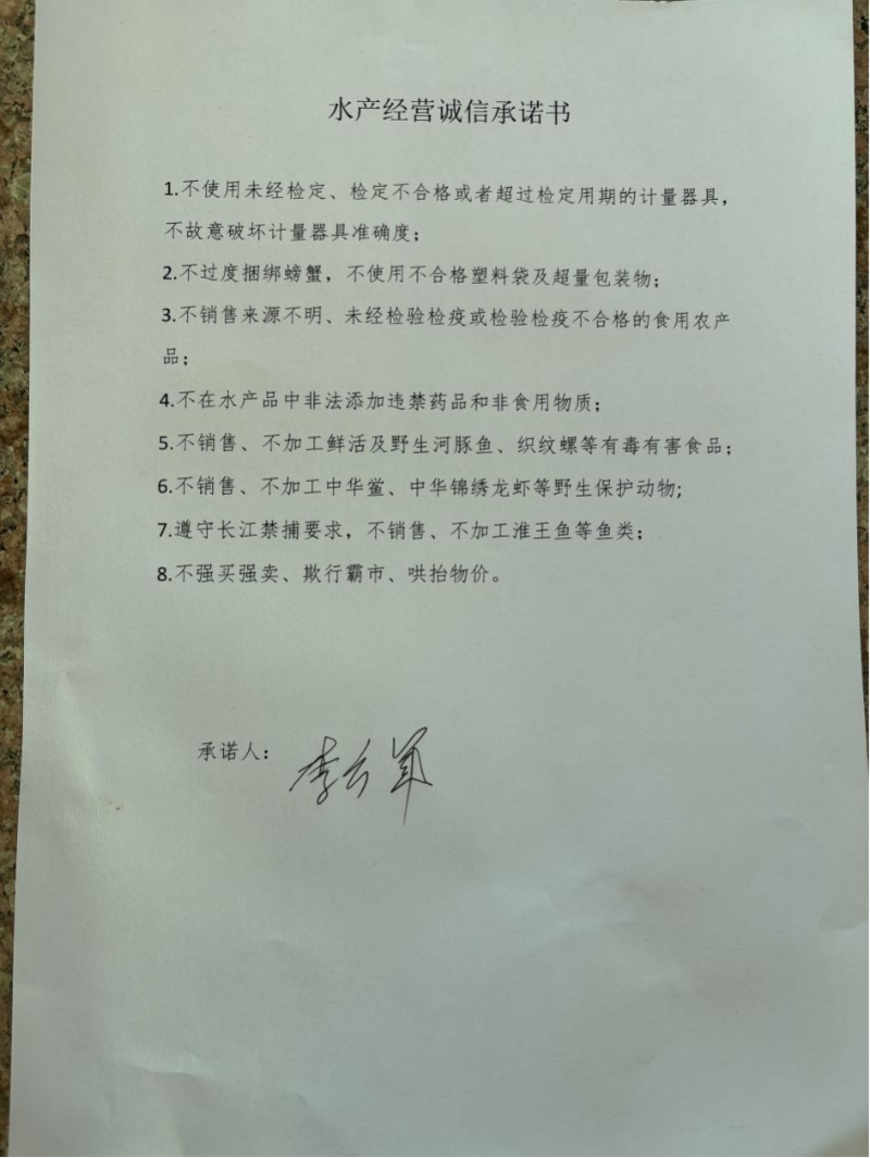 近日,谢家集区市场监督管理局为积极响应“长江禁捕”政策,规范水产品市场经营,该局执法人员编写了《水产经营诚信承诺书》,并走进水产交易现场,向经营户宣传其中内容。经过执法人员讲解之后,水产经营户们积极主动做出承诺,并签订《水产经营诚信承诺书》。
