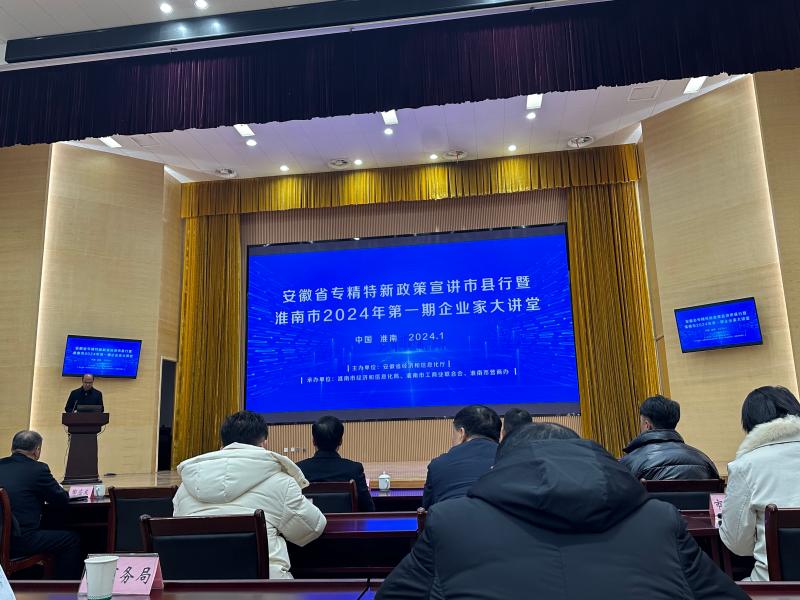 2024年1月25日下午,淮南市2024年第一期企业家大讲堂开讲,本次大讲堂以专精特新企业培育和专精特新“小巨人”企业培育为主题,谢家集小巨人培育库4家企业和省专精特新培育库7家企业以及谢区经信局领导参会。