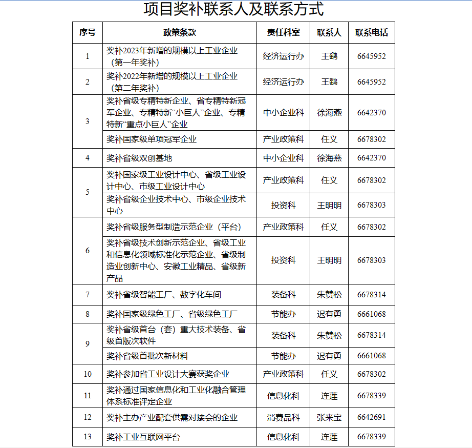 2.奖补条件:2023年新认定为省级服务型制造示范企业(平台)、省级技术创新示范企业、省级工业和信息化领域标准化示范企业、省级制造业创新中心、安徽工业精品、省级新产品,且未获得省级奖补的企业。