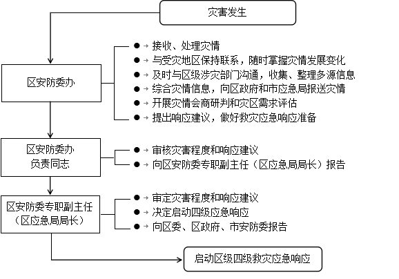 灾害发生后,区安防委办经分析评估,认定灾情达到启动标准,区安防委专职副主任(区应急局局长)决定启动四级响应,同时向区委、区政府、市安防委汇报。