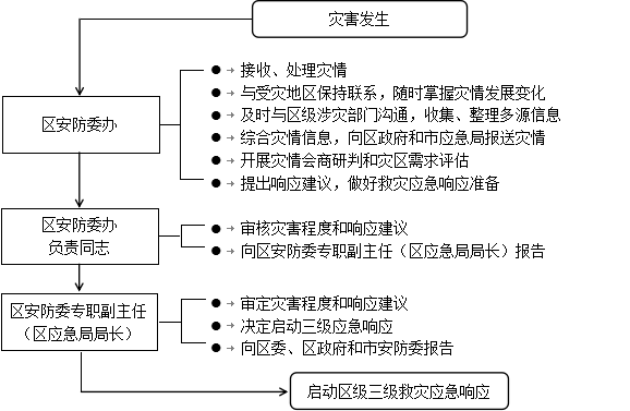 灾害发生后,区安防委办经分析评估,认定灾情达到启动标准,区安防委专职副主任(区应急局局长)决定启动三级响应,并向区委、区政府和市安防委报告。