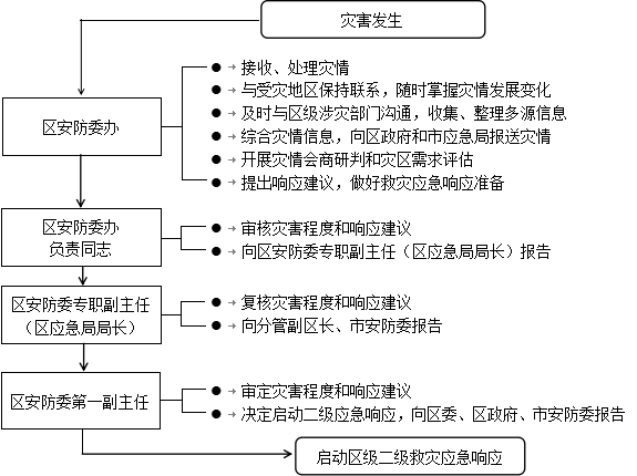 灾害发生后,区安防委办经分析评估,认定灾情达到启动标准,向区安防委提出启动二级响应的建议,区安防委第一副主任决定启动二级响应,并向区委、区政府和市安防委报告。