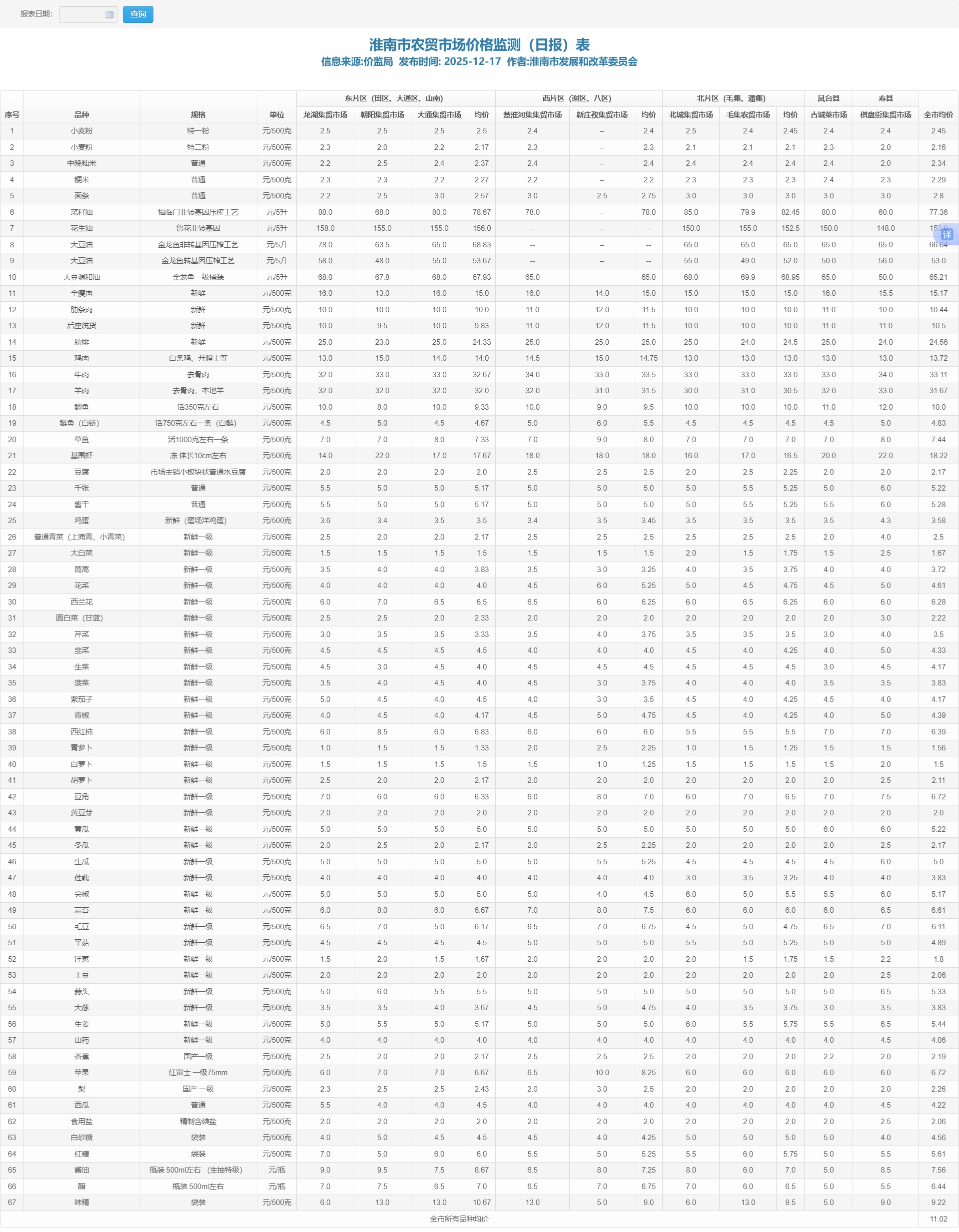 淮南市农贸市场价格监测表(2025年12月17日)