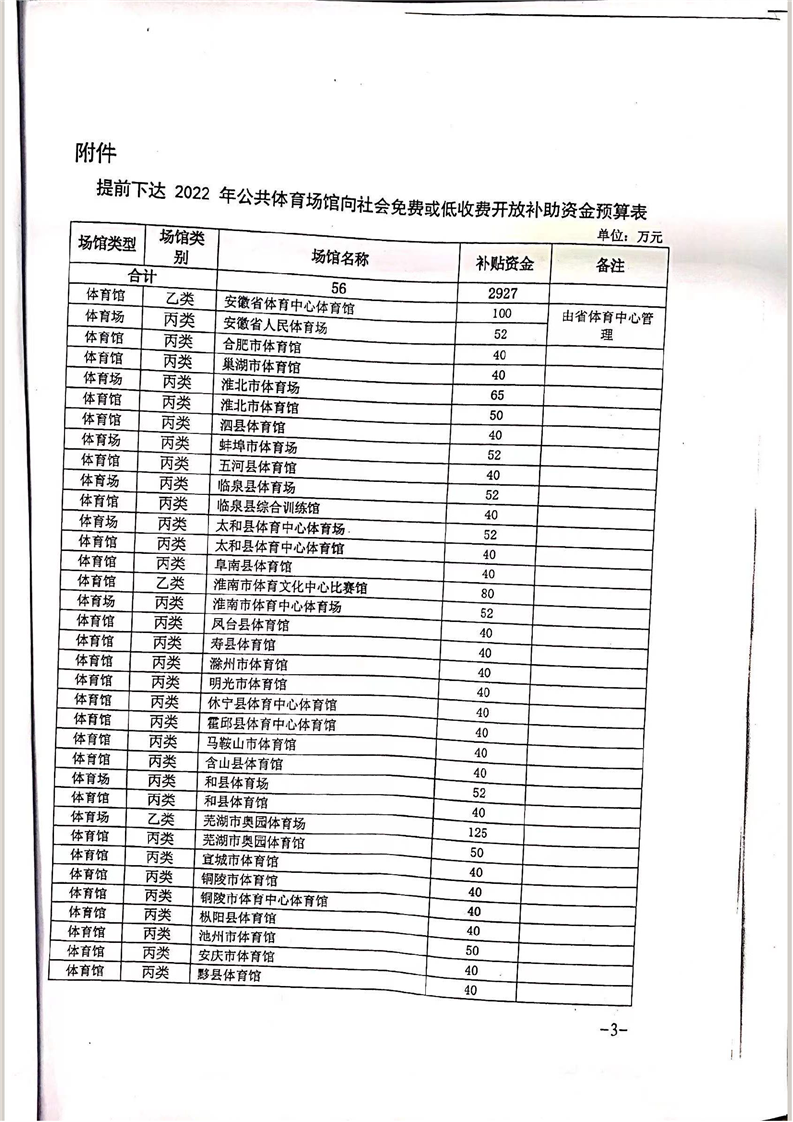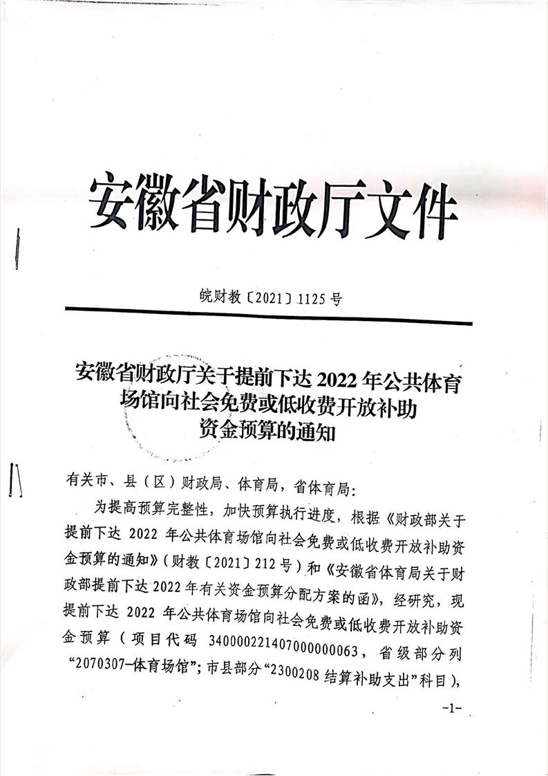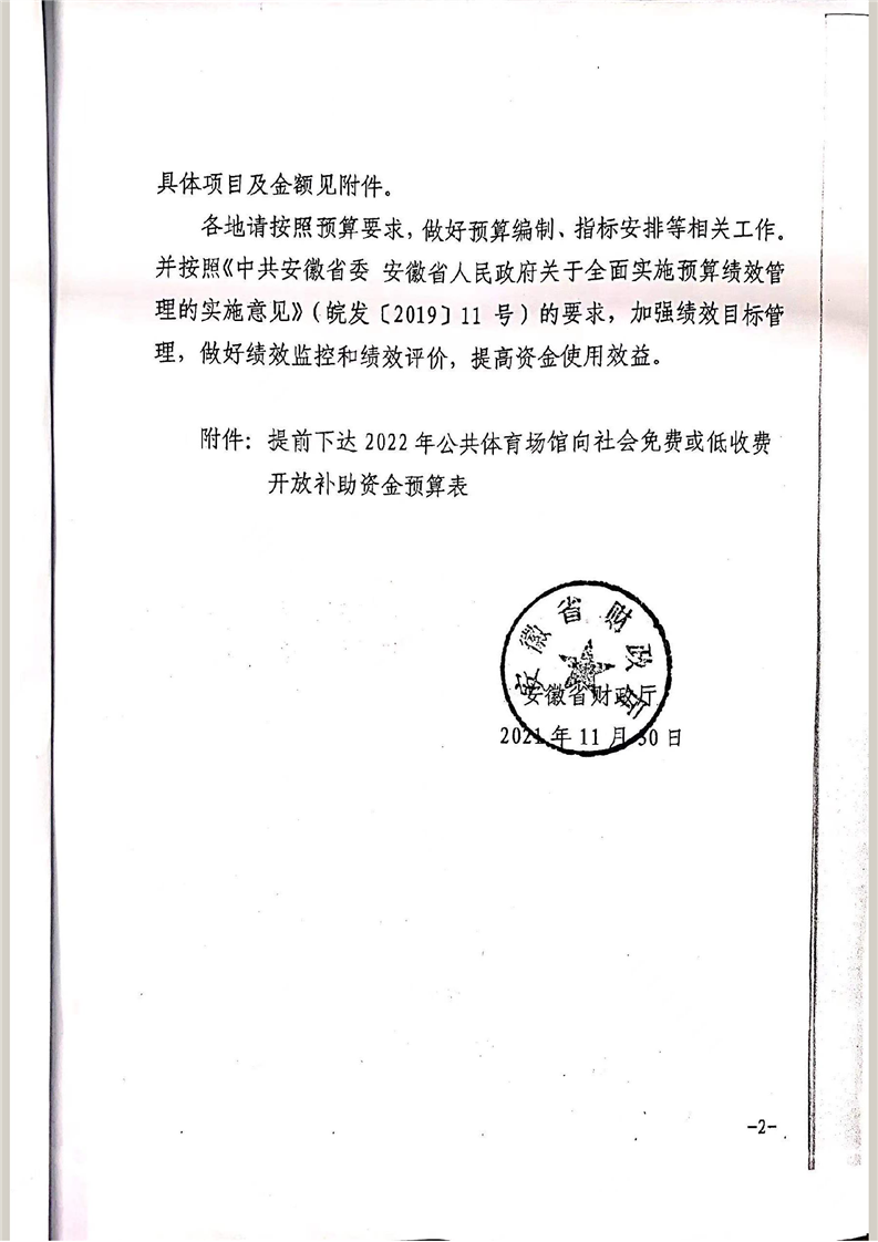 安徽省财政厅关于提前下达2022年公共体育场馆向社会免费或低收费开放补助资金预算的通知