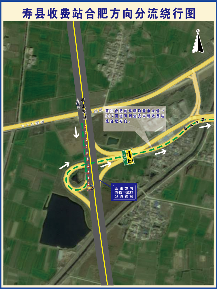 寿县道口:前往合肥的车辆沿春申大道→237国道可到达安丰塘收费站往合肥方向;
