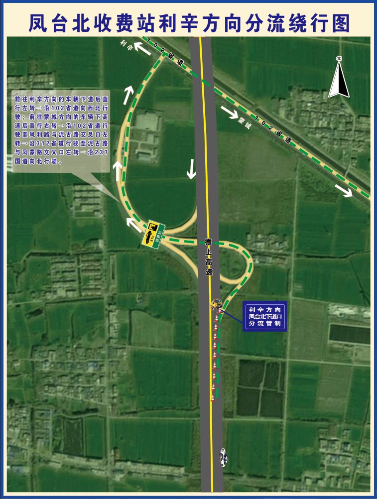 前往利辛方向的车辆经凤城大道→南湖大道→区二路→永幸大道→237国道→102省道可到达凤台北收费站往利辛方向。