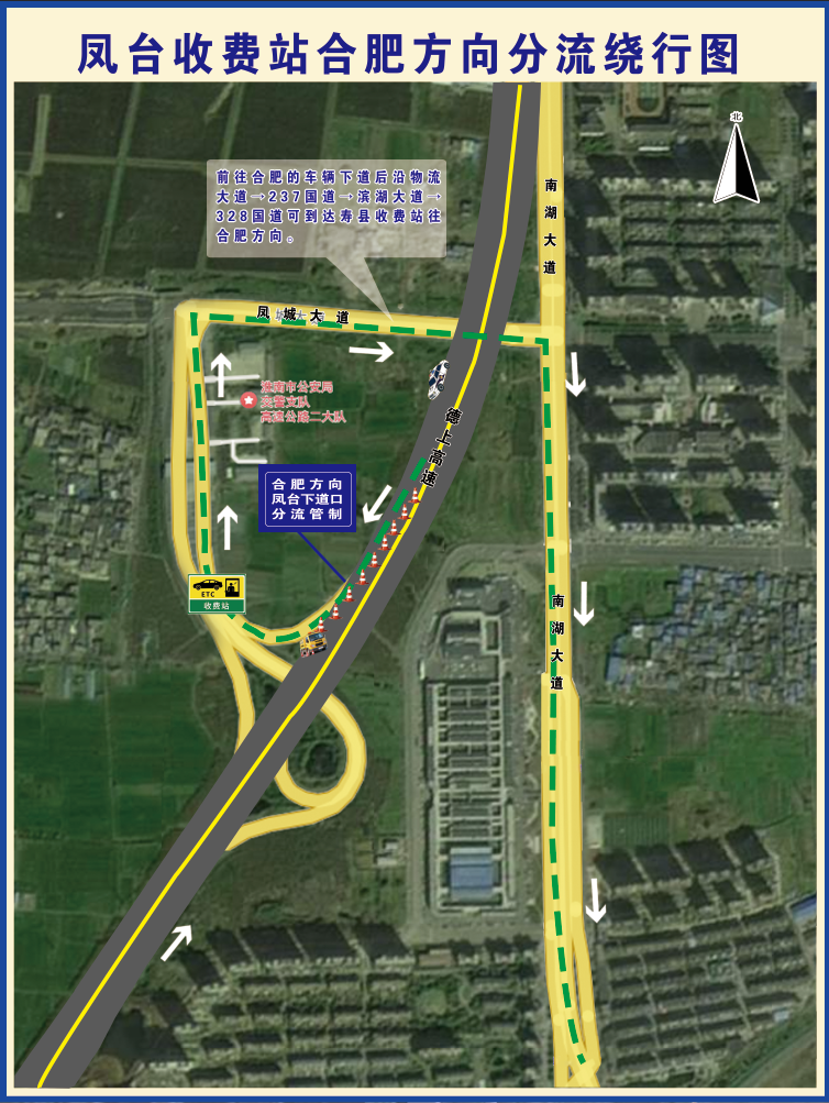 5.凤台高速道口:前往淮南方向车辆由凤台淮河二桥经237国道通行;前往合肥的车辆下道后沿物流大道→237国道→滨湖大道→328国道可到达寿县收费站往合肥方向;