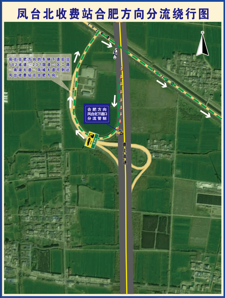 6.凤台北(马店)道口:前往凤台、合肥方向车辆经102省道通行;前往合肥方向的车辆下道后沿102省道→237国道→区二路→南湖大道→凤城大道可到达凤台收费站往合肥方向;