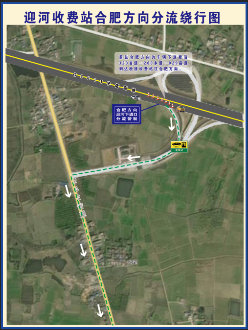 迎河道口:前往六安方向沿242省道行驶;往北淮南寿县方向沿242省道经328国道行驶;前往合肥方向的车辆下道后沿323省道→280乡道→029县道到达板桥收费站往合肥方向;