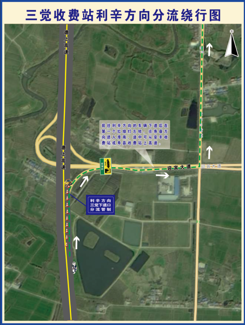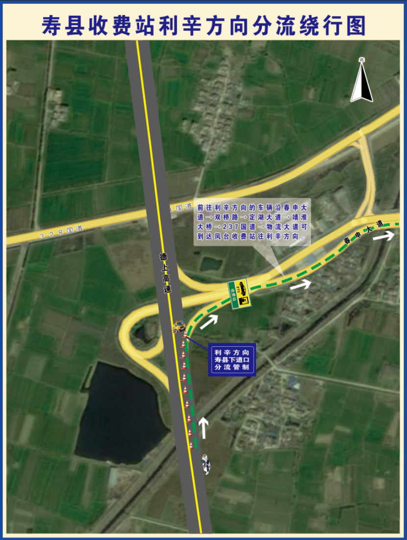 前往利辛方向的车辆下道后沿237国道→春申大道可到达寿县收费站往利辛方向。