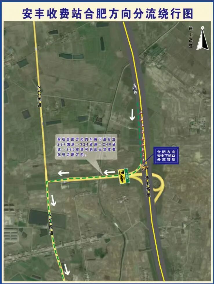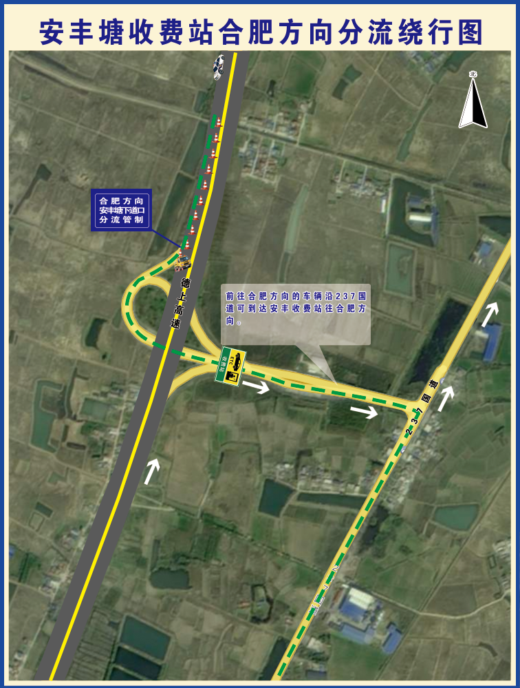 前往合肥方向的车辆沿237国道可到达安丰收费站往合肥方向;