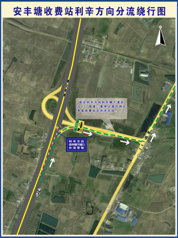 前往利辛方向的车辆下道后,沿237国道可到达安丰塘收费站往利辛方向。