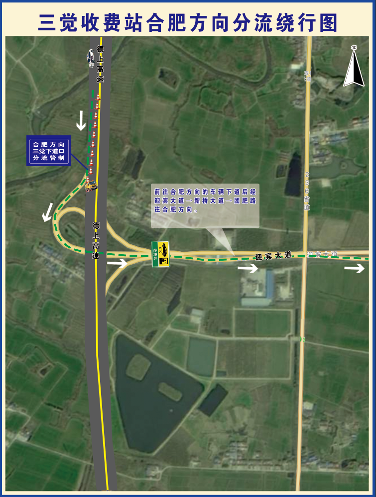 前往合肥方向的车辆下道后经迎宾大道→新桥大道→团肥路往合肥方向;