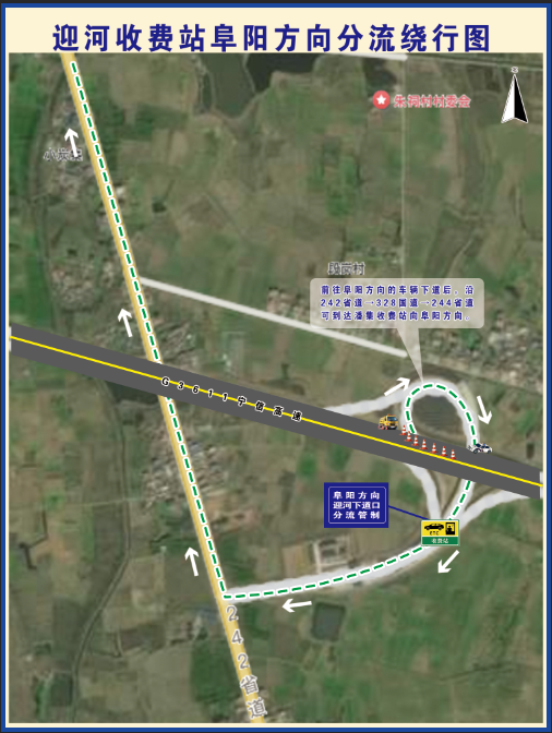前往阜阳方向的车辆下道后,沿242省道→328国道→244省道可到达潘集收费站向阜阳方向。