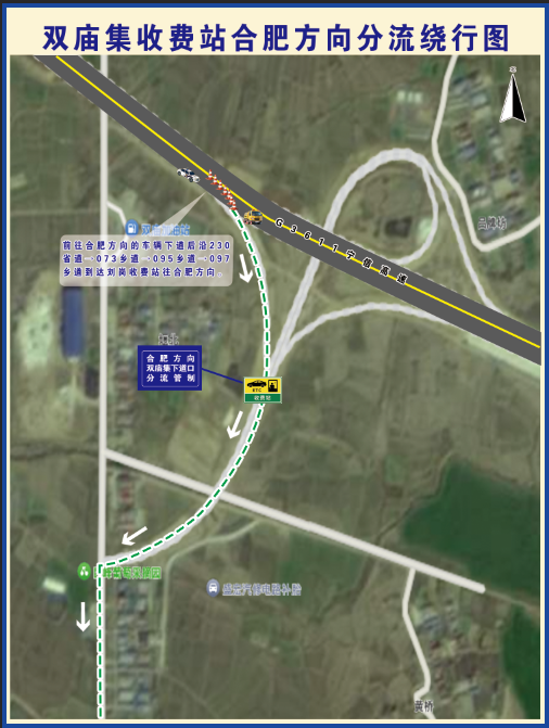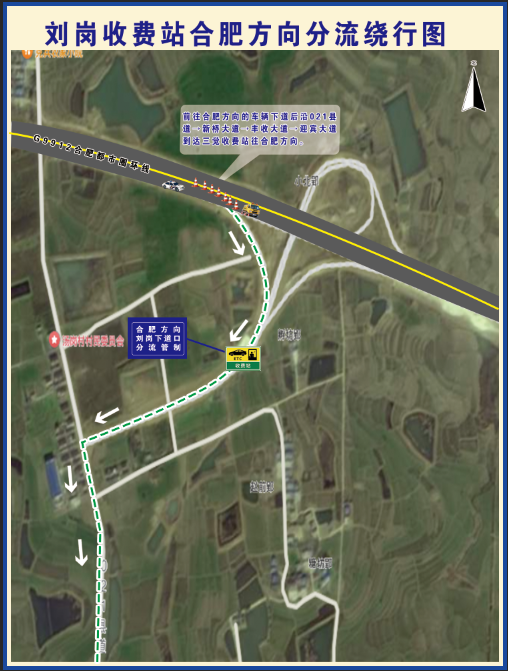 前往合肥方向的车辆下道后沿230省道→073乡道→095乡道→097乡道到达刘岗收费站往合肥方向。