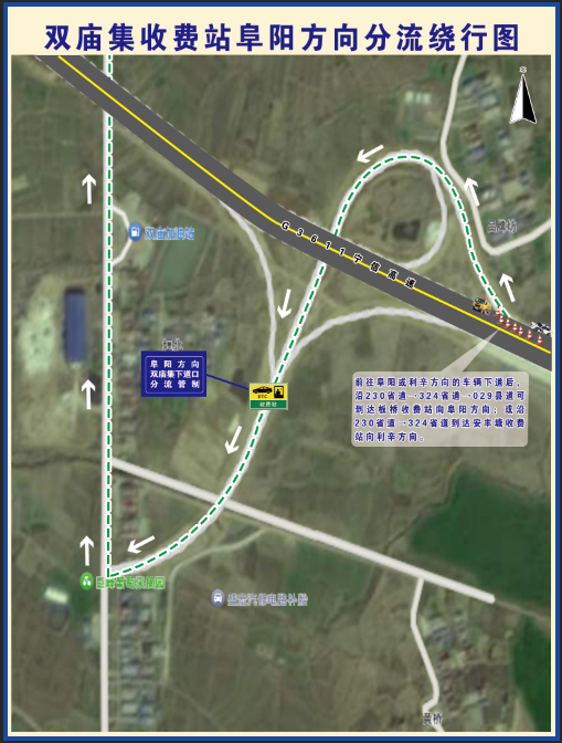双庙道口:前往阜阳或利辛方向的车辆下道后,沿230省道→324省道→029县道可到达板桥收费站向阜阳方向;或沿230省道→324省道到达安丰塘收费站向利辛方向。