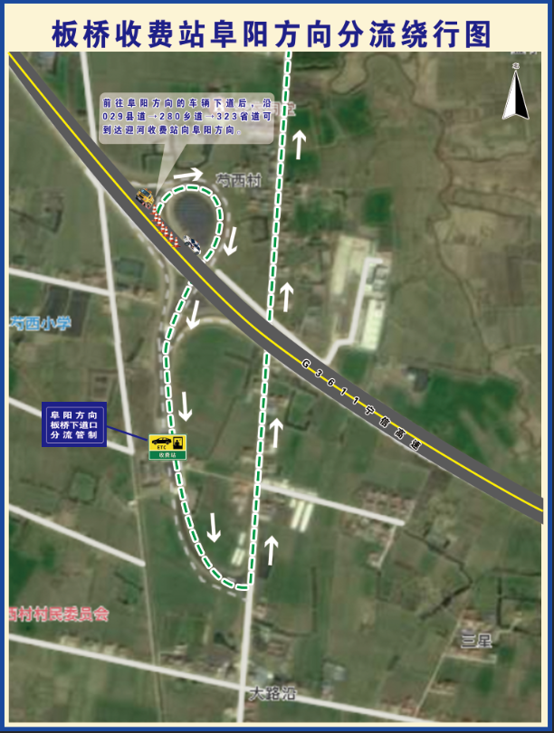 板桥道口:前往阜阳方向的车辆下道后,沿029县道→280乡道→323省道可到达迎河收费站向阜阳方向。