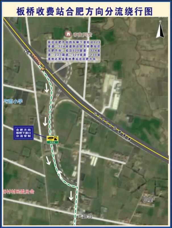 前往合肥方向的车辆下道后沿029县道→324省道到达安丰收费站往合肥方向;或沿029县道→324省道→237国道→324省道→230省道到达双庙集收费站往合肥方向。
