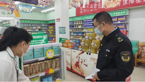 阳光市场监管所加大特殊食品日常监管,压实主体责任,确保消费者权益,重点加大对辖区从事特殊食品经营单位的资质、标签、专区(专柜)销售、专门消费提示牌等内容检查。对不符合规定的现场提醒,提出整改意见,事后分类建档,选取重点问题、关键事项跟踪检查,确保检查发现的问题逐一整改完毕。同时,采用线上线下相结合的方式推广特食考核小程序,积极推进特殊食品抽查考核,帮助特殊食品经营单位安全管理人员了解抽查考核步骤,学习特殊食品相关从业知识,同时向经营者宣传了《中华人民共和国食品安全法》等相关法律法规。