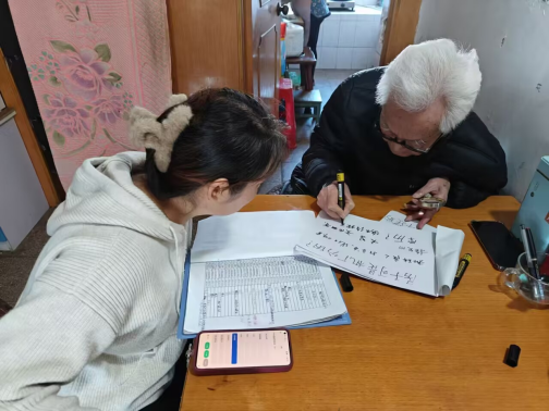 在入户登记过程中,调查员佩戴统一证件,严格按照《统计法》规定,对抽中住户进行入户访问登记。他们严谨细致,以耐心与智慧应对各种特殊情况。在新建二村小区,调查工作就遇到了一户特殊家庭——家中是一位90岁高龄的退伍军人及其配偶。由于老人年事已高,听力严重衰退,常规的问答沟通方式遇到了巨大挑战。面对这一情况,我们的调查员展现了高度的责任感和灵活的工作方法。他们不急不躁,通过一笔一划地写字与老人进行书面交流,同时,在征得老人及其家人同意后,向了解家庭情况的住家保姆进行辅助询问,多渠道核实信息。经过一番耐心、细致的沟通,最终准确、完整地采集了所需的登记信息,圆满完成了该户的调查任务。