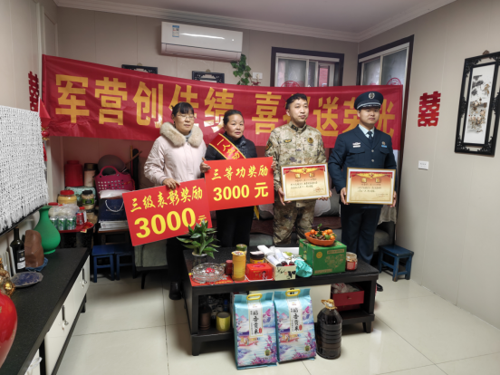 在现役军人家中,工作人员为探亲在家的军人及家属戴上绶带,献上鲜花,悬挂“一人立功 全家光荣”的横幅,向他们致以热烈祝贺和崇高敬意。在交谈中,详细了解张家恒在部队服役情况和家庭生活情况,称赞他用实际行动践行军人担当,为家乡人民争得了荣誉。