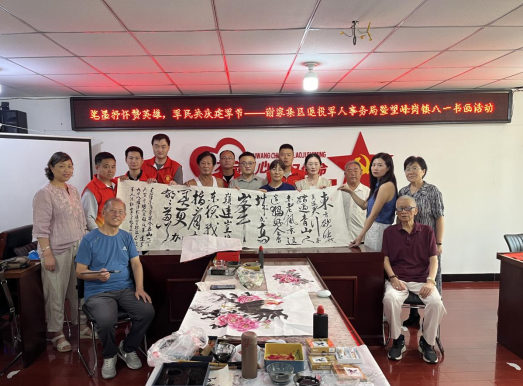 7月29日上午, 望峰岗镇淮望社区举办墨抒怀赞英雄·军民共庆建军节双拥书画活动区退役军人事务局副局长李艳、望峰岗镇武装部长王振兴、社区退役军人志愿者代表、书画爱好者及社区工作者齐聚一堂,以笔墨寄深情,用书画赞英雄。