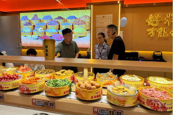 在辖区餐饮单位,检查组深入后厨,检查店铺卫生状况、餐具消毒、原料保质期及从业人员健康证,并现场指导餐饮店铺规范经营。检查组负责人指出:“食品安全是民生底线,要压实企业主体责任,把好从原料到餐桌的每一道关口。”