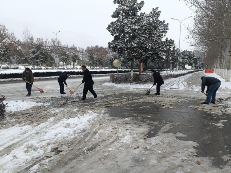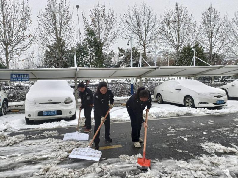 清晨,政务中心全体工作人员手持铁锹、扫帚等工具,对大厅入口、台阶及周边停车场等重点区域进行集中清理。大家不畏严寒、分工协作,扫雪、除冰干劲十足,经过奋战,顺利清除了主要通行区域的积雪和冰层,为办事群众开辟出一条安全畅通的 “暖心通道”。